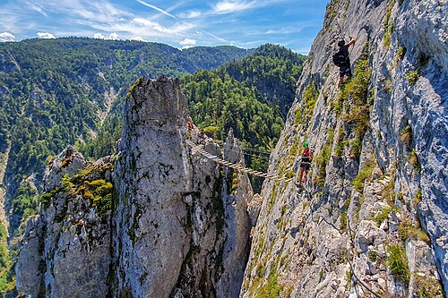 The 200-metre ascent takes you to the top for spectacular mountain views. No climbing experience needed — you’re harnessed and guided the entire way. But a head for heights helps.